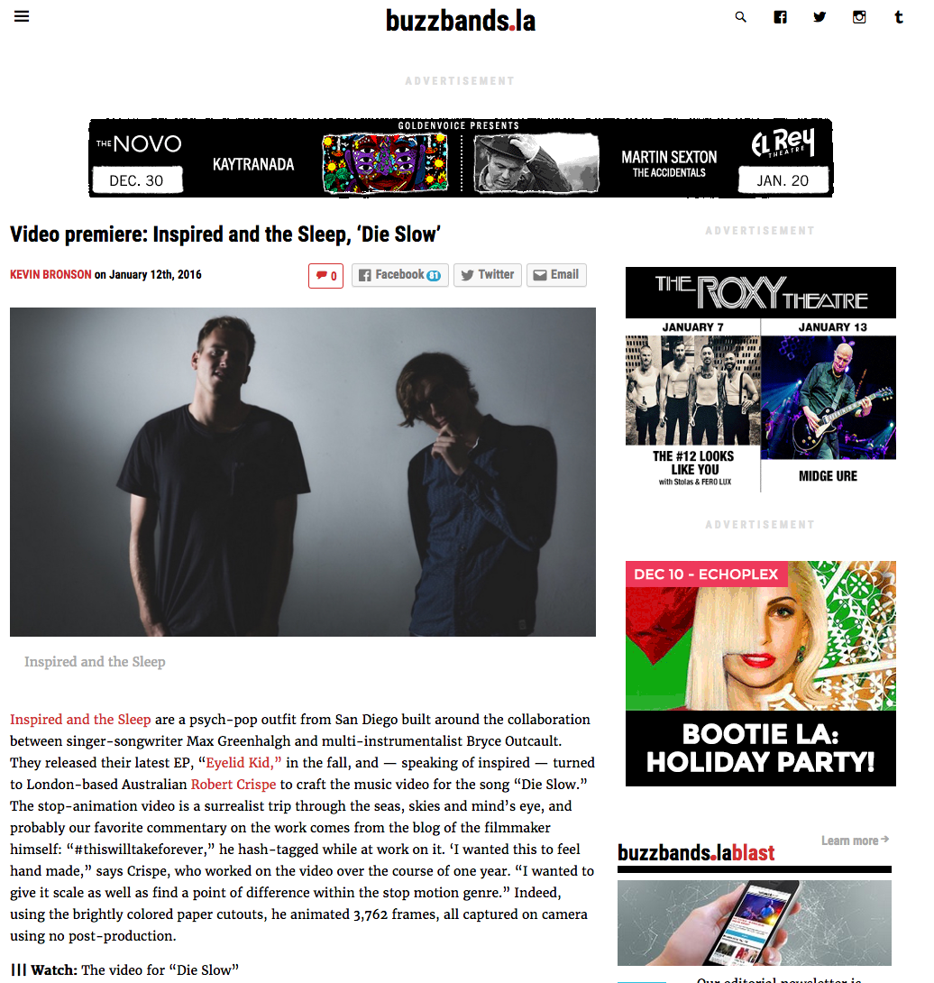 Inspired & the Sleep's animated stop motion music video for their song "Die Slow" premiered on Los Angeles event blog Buzz Bands LA. The video, made by Australian animator Robert Crispe, took an entire year to create. The result is a beautiful display of underwater color's that shines through the modern deluge of online content
