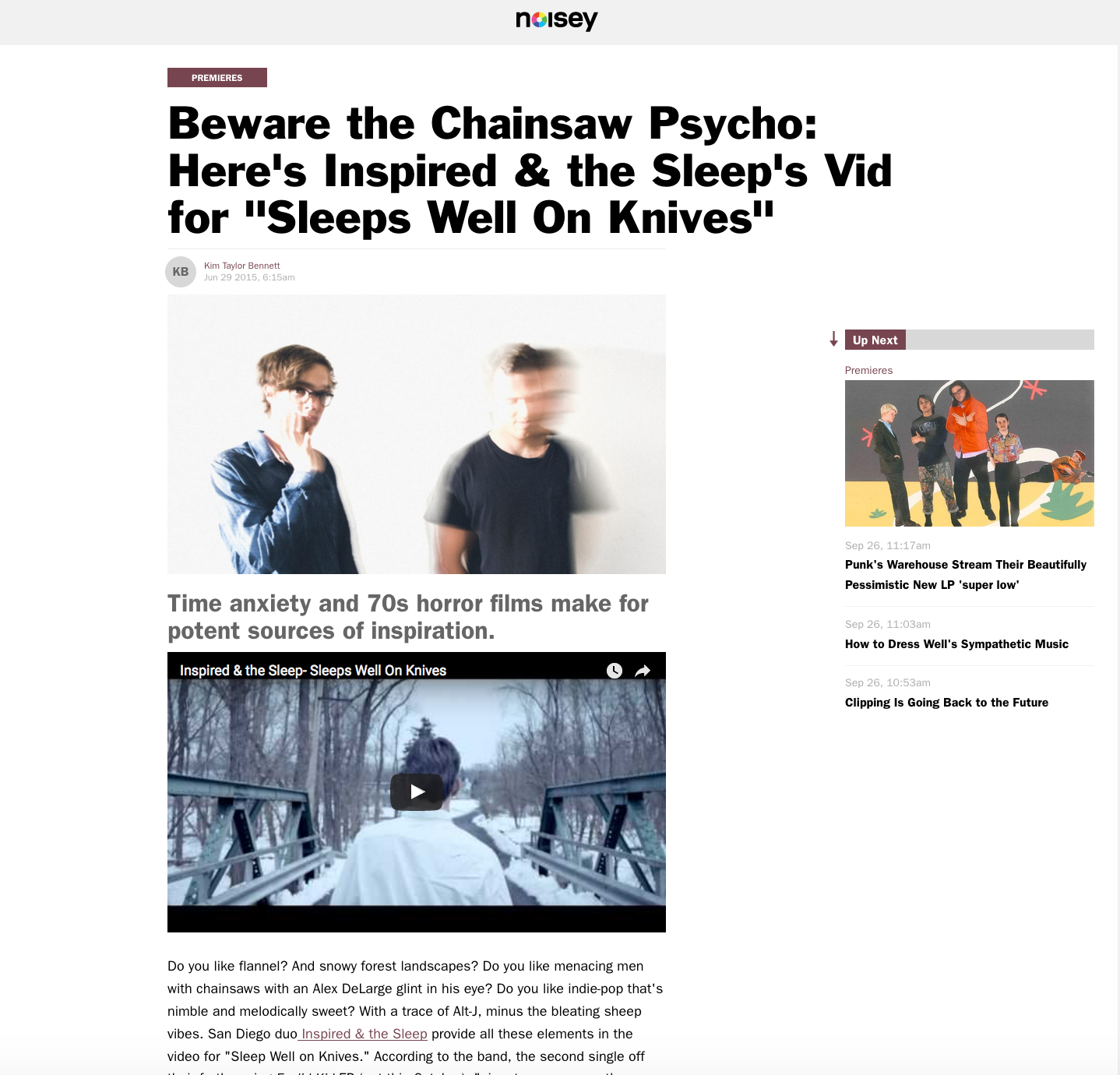Inspired & the Sleep's chilling music video for "Sleeps Well On Knives" premiered on the relevant culture publication Noisey! The video was directed in New York by BullMoose productions and has made its way to recieve massive amounts of online attention